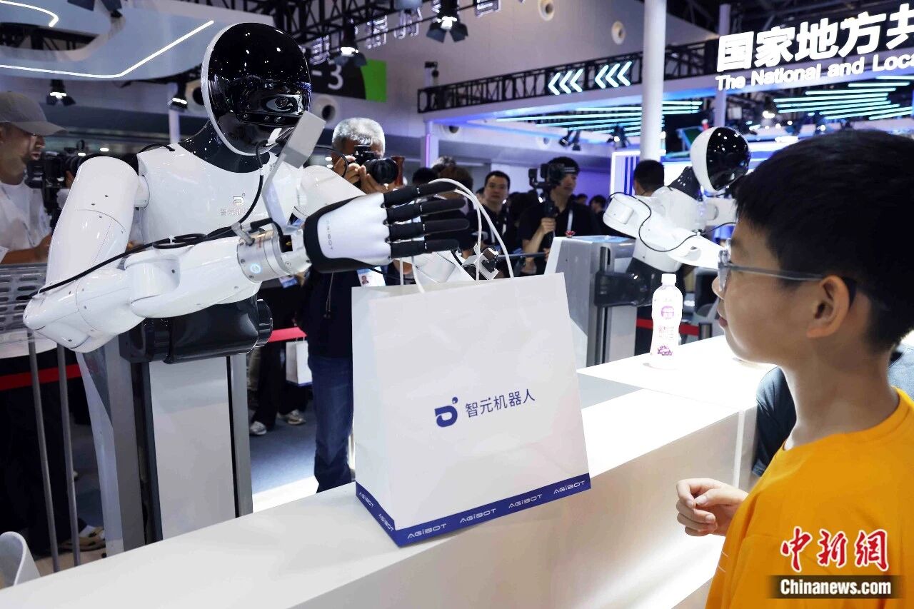 2025年7月26日,2025世界人工智能大會在上海開幕。圖為機器人分發產品資料。中新社記者 湯彥俊 攝