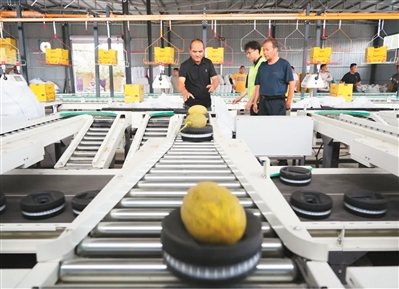 哈密市伊州區花園鄉哈密瓜分選中心智能分選設備正在運行。