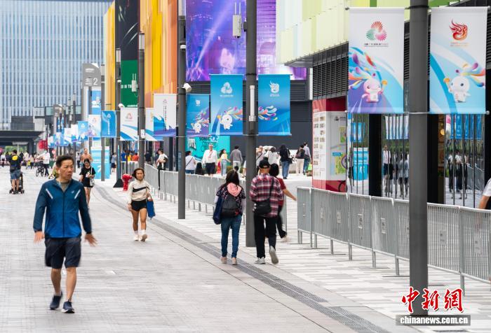 11月1日,香港新晉地標啟德體育園的體育大道沿途遍布第十五屆全國運動會(簡稱“十五運會”)裝飾宣傳元素,靜待本屆全運會于11月9日正式開幕。圖為體育大道沿線懸挂將于11月2日舉行的十五運會香港賽區火炬傳遞活動的裝飾宣傳物料。 中新社記者 侯宇 攝