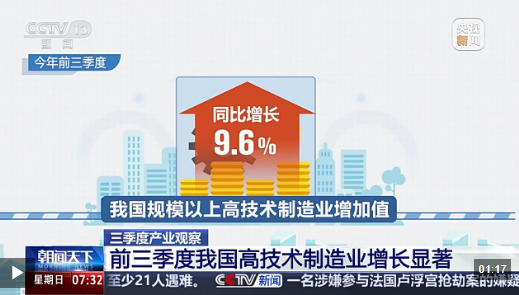 今年前三季度,我國規模以上高技術制造業增加值同比增長9.6%,快于工業平均水平3.4個百分點。規模以上高技術制造業對全部規上工業增長的貢獻率為24.7%,工業經濟“壓艙石”作用凸顯。