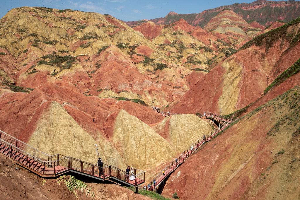 漫步景區,放眼望去,紅色與青灰色交錯分布,恍若置身于一幅水墨丹青中。移步登高,起伏的“彩丘海浪”直通天際。“人在畫中遊,我從景中來。”這是不少遊客的感受。