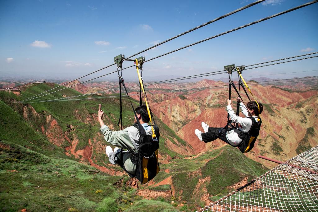 首次體驗低空飛行的遊客劉大偉讚嘆:“從空中俯瞰,連綿的彩丘和丹霞地貌猶如大地潑墨而成的瑰麗畫卷,雄渾而又夢幻。”
