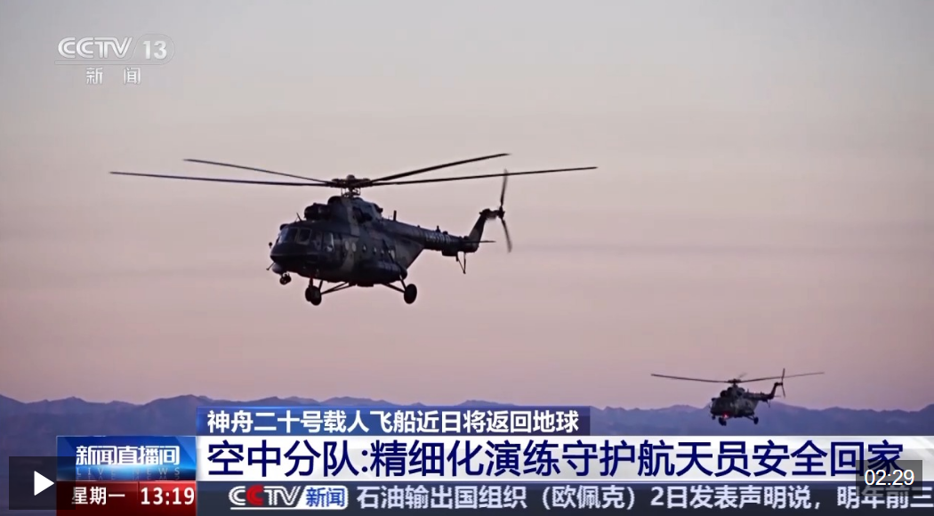 神舟二十號搜救回收任務空中分隊 唐梓峰:目前我們已做好萬全的準備,人員思想狀態穩定,技術能力過硬,裝備狀態良好。我們整個空中分隊有能力、有信心圓滿完成回收任務。