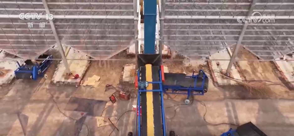 烘幹後的玉米去哪里了?大家抬頭看,答案在樓頂上這些高速傳送帶,玉米通過傳送帶進入下一個加工區。
