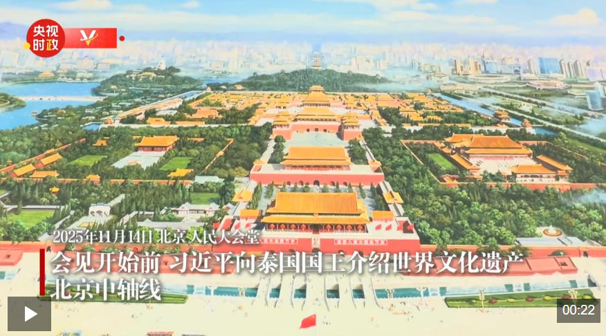 會見開始前,習近平向泰國國王介紹世界文化遺產——北京中軸線。