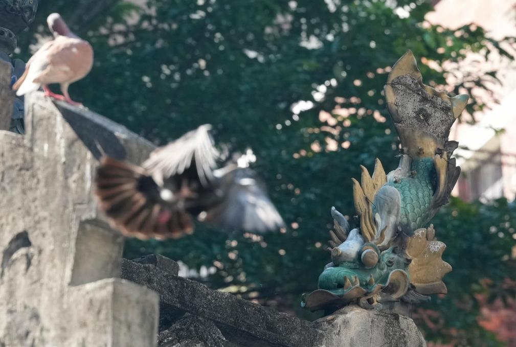 11月12日,在香港的觀音廟屋頂上,立著鰲魚的雕塑。新華社記者 吳魯 攝