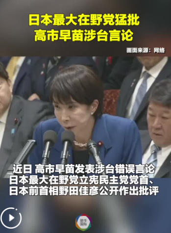 近日,日本首相高市早苗發表涉臺錯誤言論。日本最大在野黨立憲民主黨黨首、日本前首相野田佳彥和立憲民主黨政務調查會長本莊知史16日發聲,嚴厲批評高市早苗,稱其涉臺言論“越界”。(視頻:羅林嵐)