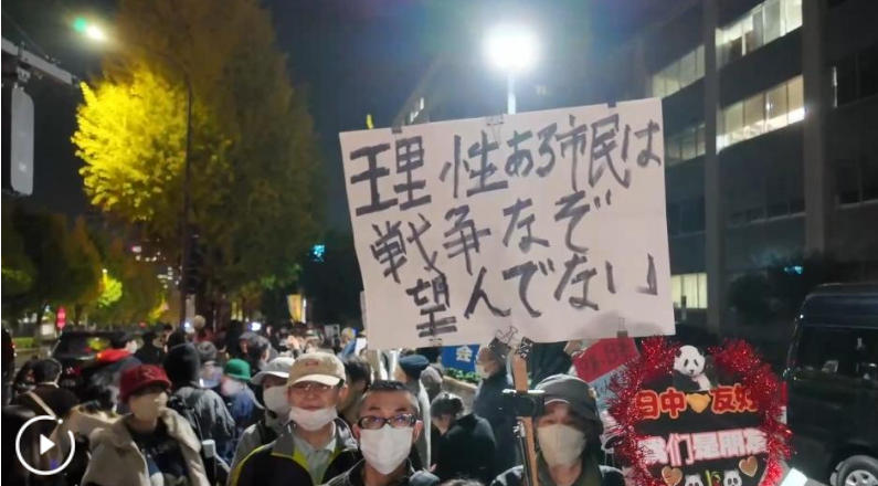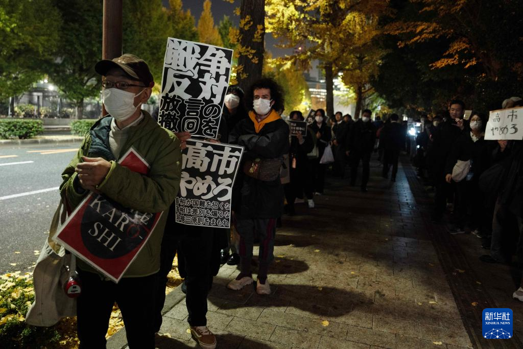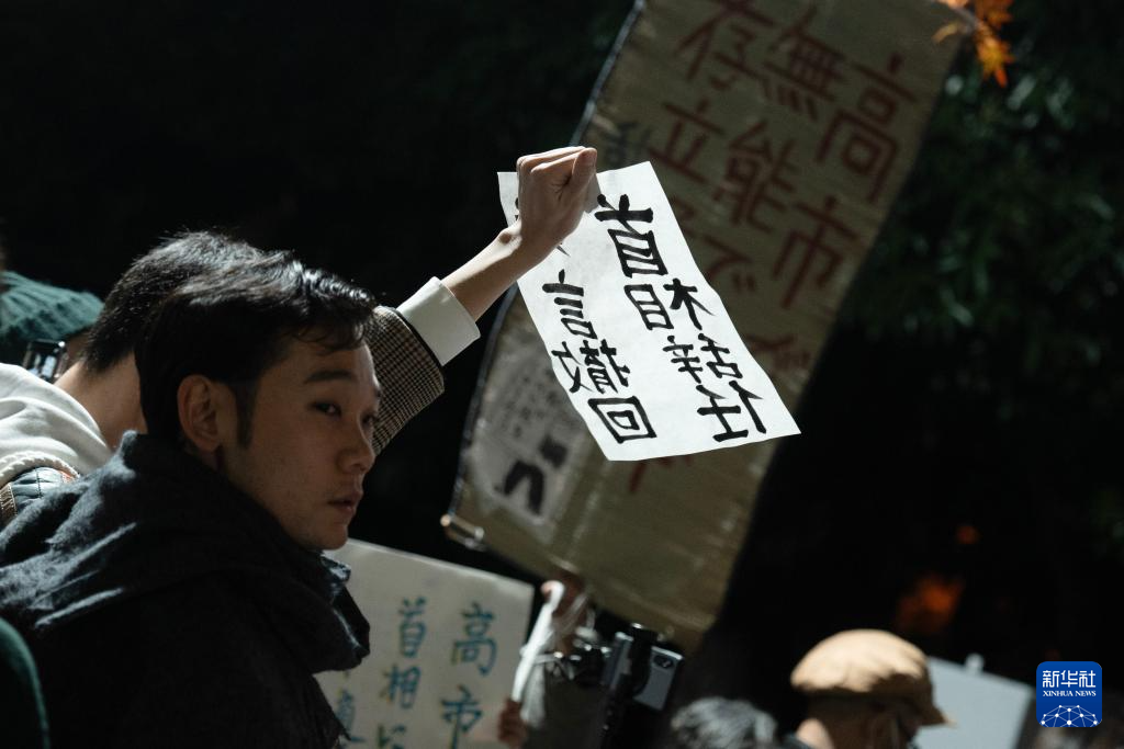 集會定于當地時間20時開始。19時前後,便有民眾陸續趕到現場。抗議者們舉著寫有“撤回言論 反對戰爭”“因高市才有事”“高市下臺”等標語的牌子,高喊“禁止軍國主義復燃”等口號。多名抗議者要求高市對其涉臺言論負責並辭去首相職務。