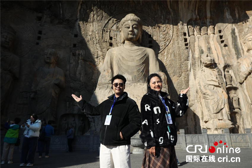 陳慕筠(右)和老撾網紅王偉一起打卡龍門石窟