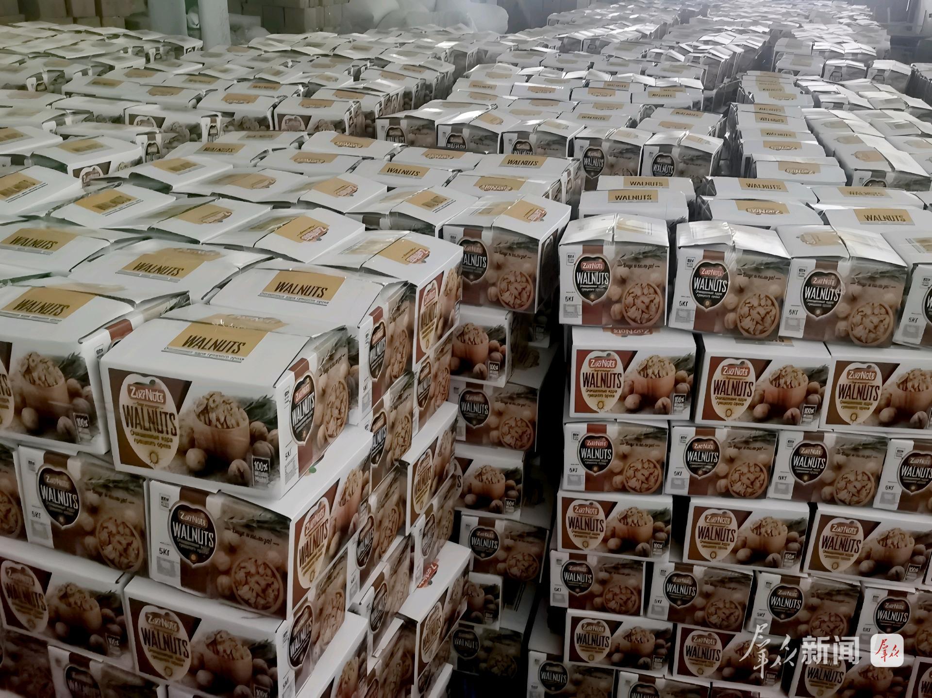 10月11日,記者在西北核桃物流園內看到,成堆的優質核桃仁在園區裝箱,貨箱旁的立牌上標注著銷售地,一部分發往國內市場,一部分發往俄羅斯、土耳其等國家和地區。