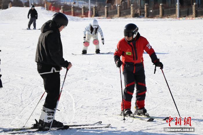 11月21日,巴孜爾別克·阿得里(右一)正在為遊客講解滑雪技巧。 茍繼鵬 攝