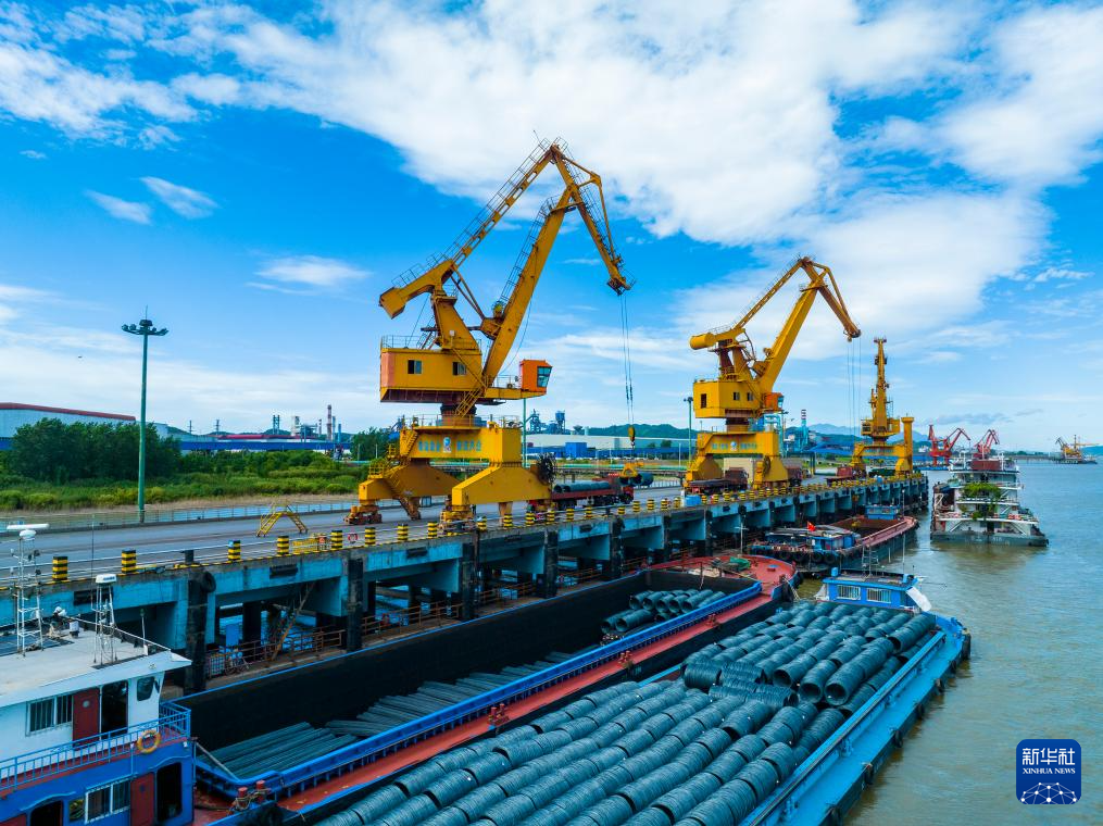 在方大集團九江萍鋼鋼鐵有限公司位于長江邊的碼頭,塔吊在裝卸貨物(2025年7月20日攝)。新華社發(張玉攝)