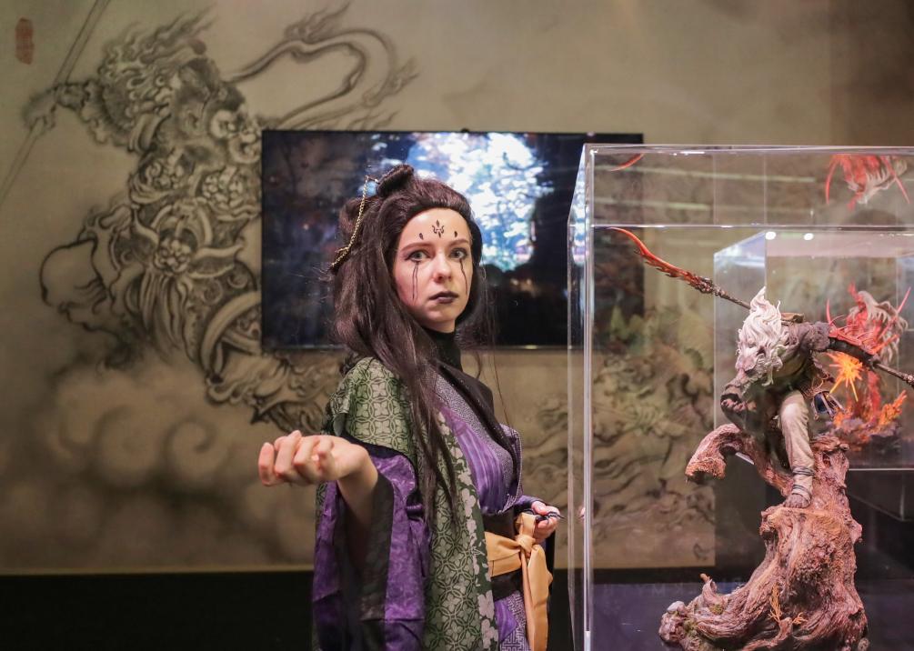 8月20日,在德國科隆,一名《黑神話:悟空》遊戲角色扮演者在遊戲科學展臺與模型合影。(新華社記者 張帆 攝)
