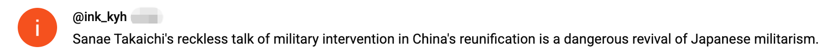 網友@ink_kyh認為:“高市早苗魯莽地談論軍事幹預中國統一,這是日本軍國主義的危險復活。”