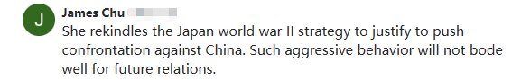 網友@James Chu表示:“(高市早苗)她重新煽動日本二戰時期的戰略,以此為理由推動對抗中國。這種咄咄逼人的行為對未來的中日關係發展絕無好處。”