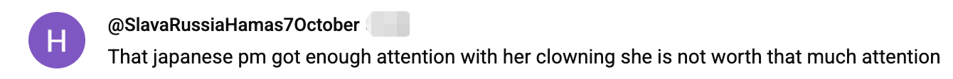 網友@SlavaRussiaHamas7October說:“那位日本首相靠著她的滑稽表演已經夠引人注目了,她不值得再獲得這麼多關注。”