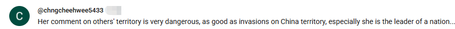 網友@chngcheehwee5433認為:“她(高市早苗)對其他國家領土的評論非常危險,無異于入侵中國領土,尤其她還是一個國家的領導人。”