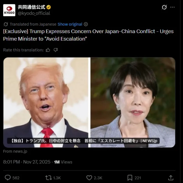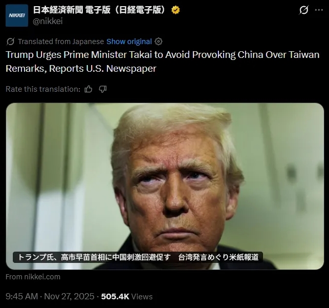 不過,盡管日本政府否認,包括路透社在內的更多西方媒體,卻陸續通過其他信源印證了特朗普讓高市早苗不要刺激中國的情況。就連日本共同社也在報道中提及此事——當然,共同社同樣遭到了日本右翼分子的圍攻。