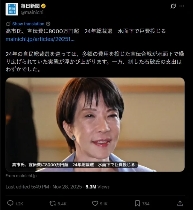 這則新聞的內容是,高市早苗在2024年日本自民黨總裁選舉期間,曾瘋狂砸了8384萬日元(約381萬元人民幣)用于宣傳自己,但最終還是輸給了石破茂,而且石破茂的宣傳開銷僅為42萬日元(約1.9萬元人民幣)。