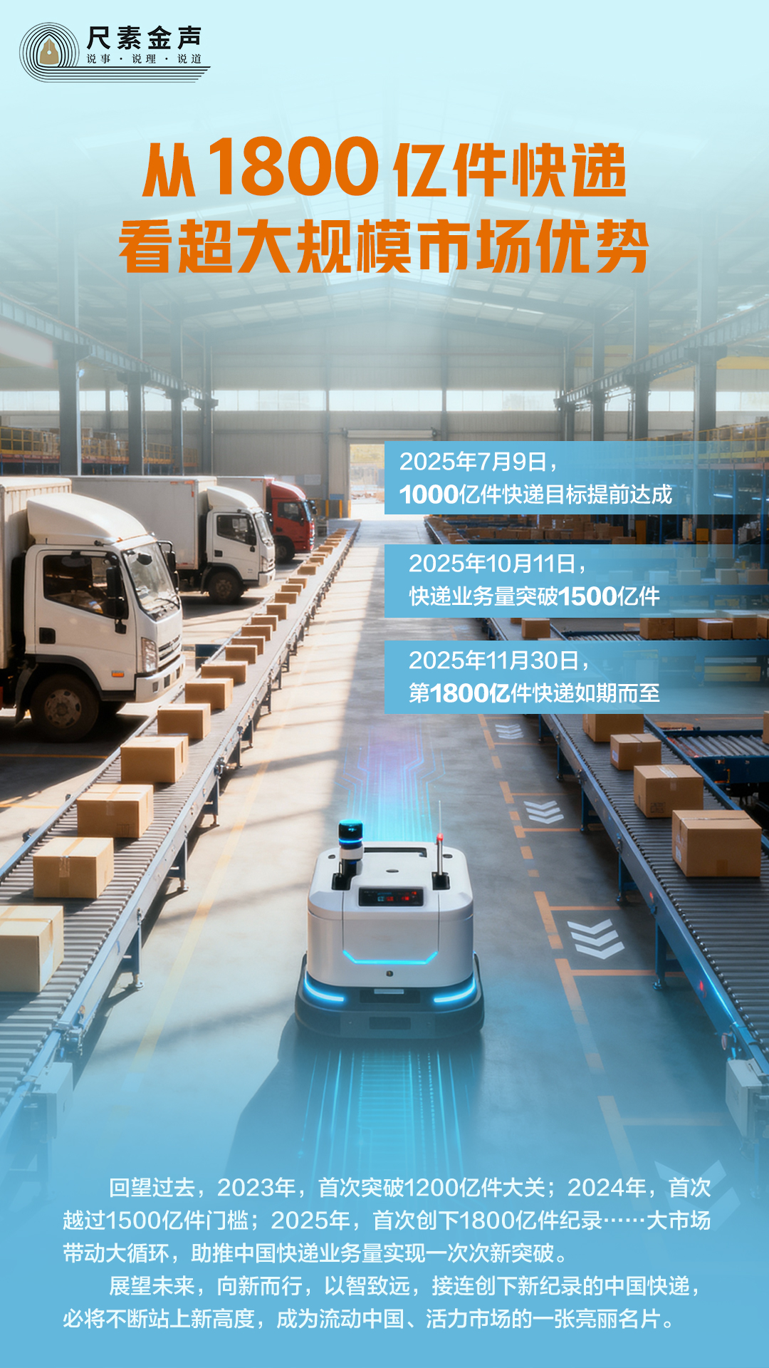 回望過去,2023年,首次突破1200億件大關;2024年,首次越過1500億件門檻;2025年,首次創下1800億件紀錄……大市場帶動大循環,助推中國快遞業務量實現一次次新突破。
