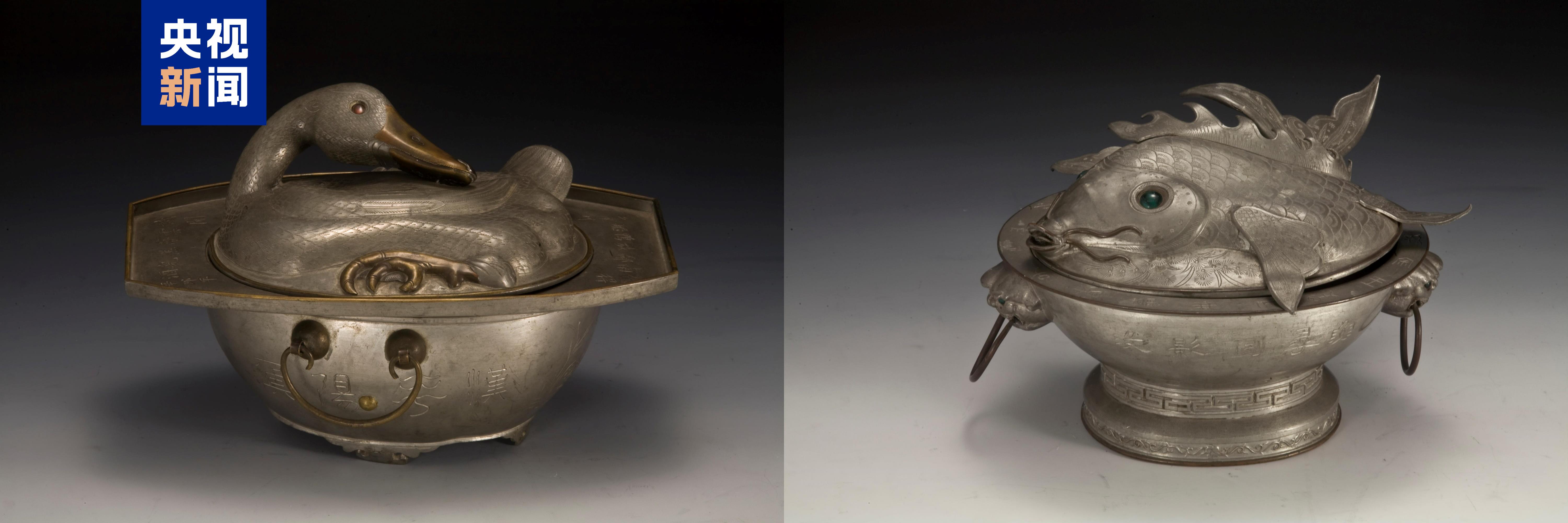 △ 清·鏨刻詩文點銅鴨形錫燙鍋(左)與清·鏨刻詩文嵌玻璃魚形錫燙鍋,點擊了解更多
