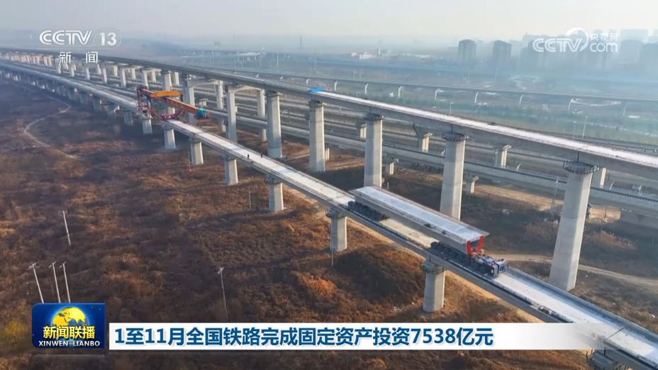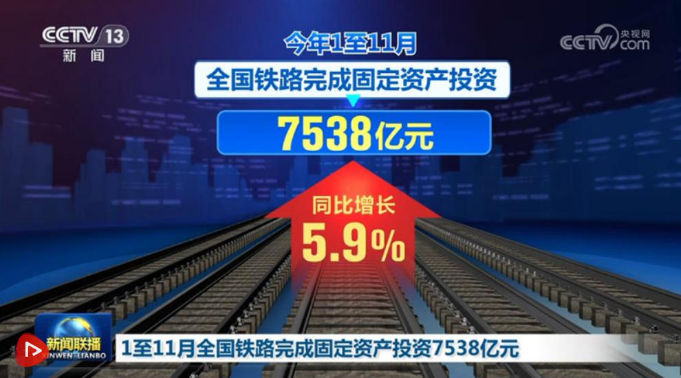 央視網消息(新聞聯播):記者從國鐵集團獲悉,今年1至11月,全國鐵路完成固定資產投資7538億元,同比增長5.9%。
