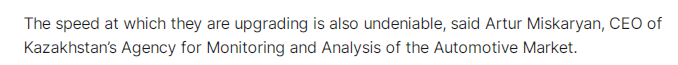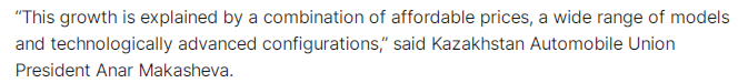 文章援引哈薩克斯坦一家汽車及配件貿易網站新車部門負責人亞博·肖姆比諾夫(Yerbol Shombinov)的話表示, “在哈薩克斯坦汽車市場上,中國汽車品牌與許多銀行有合作,可以提供相當有競爭力的購車貸款政策”。此外,中國汽車的整車定價也很有優勢。肖姆比諾夫表示,“即使在同一級別中,歐洲品牌通常也更貴。中國車型通常更經濟實惠,同時提供更多配置讓消費者選擇。”