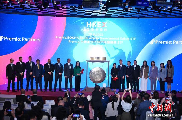 2025年5月29日,香港交易及結算所有限公司與沙特阿拉伯證券交易所集團在香港合辦“香港——沙特資本市場論壇”。現場亦舉行Premia中銀香港沙特伊斯蘭國債交易所買賣基金(ETF)在香港上市的敲鑼儀式。圖為香港特區政府財政司司長陳茂波(右七)等嘉賓出席敲鑼儀式。 中新社記者 李志華 攝