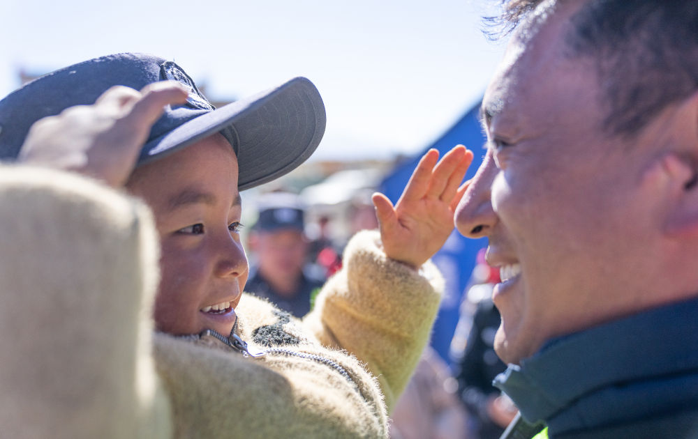 2025年1月14日,在西藏定日縣長所鄉嘎布村,一名小朋友戴上移民警察米瑪次仁的帽子敬禮。新華社記者 丁增尼達 攝