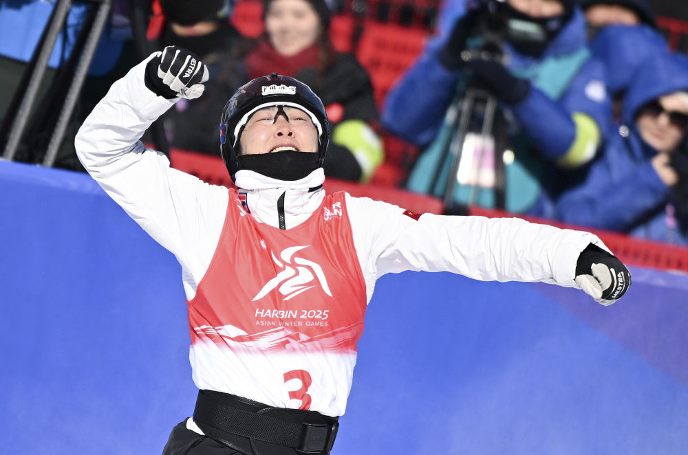 2025年2月9日,徐夢桃慶祝奪冠。當日,在亞布力舉行的第九屆亞冬會自由式滑雪女子個人空中技巧決賽中,中國選手徐夢桃、陳雪錚包攬冠亞軍。新華社記者 夏一方 攝