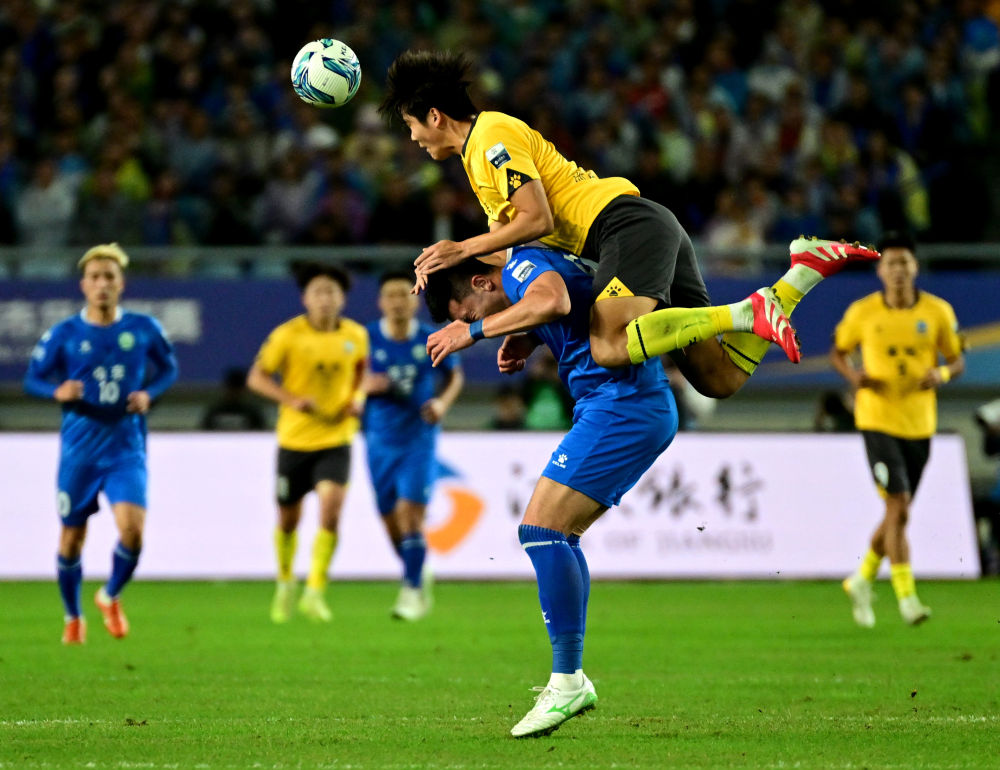 2025年10月18日,在“蘇超”半決賽中,泰州隊球員(上)與南京隊球員爭頂頭球。新華社發(曹政 攝)