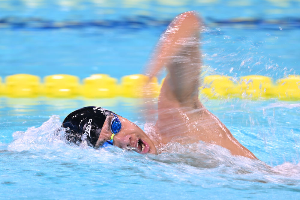 2025年11月17日,山東隊選手張展碩在比賽中。他最終獲得冠軍。當日,第十五屆全國運動會遊泳男子1500米自由泳決賽在廣東省深圳市舉行。新華社記者 陳益宸 攝