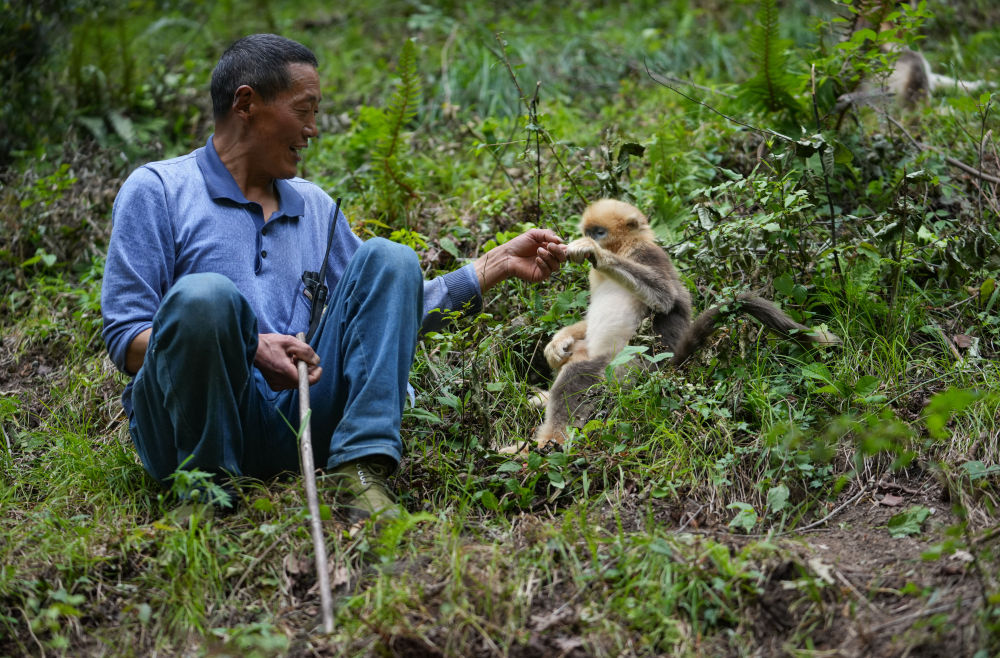 2025年5月21日,在平武川金絲猴科普自然教育基地里,巡護員徐庭友與川金絲猴握手。新華社記者 江宏景 攝