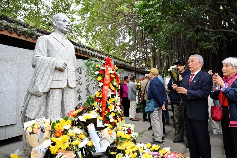 2025年11月6日,在福州市螺洲鎮的吳石故居,人們向吳石雕像敬獻鮮花表達敬意。新華社記者 林善傳 攝