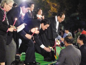 馬英九(中)參加“平安暝燭光禮拜”,將祈福燭光傳遞給民眾。來源:臺灣《聯合報》