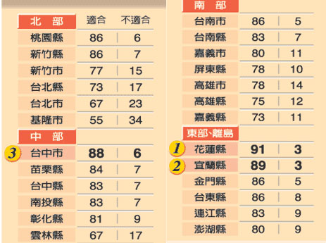 臺灣媒體針對島內25縣市民眾調查發現,認為所在縣市適合居住的民眾,大致以臺灣東部和離島縣市最多。