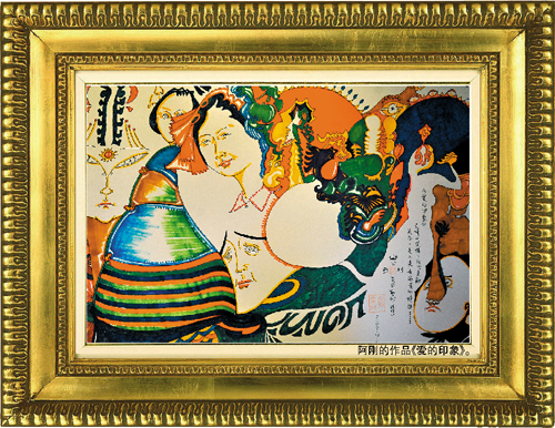 盡管擺在人們面前的阿剛畫作抽象難懂,阿剛自己卻充滿自信地將這些難懂的畫作的畫風概述為“理象派”,用阿剛的話來解釋,就是用抽象的畫風表現人生的哲理。在一幅名為《喜悅》的作品里,阿剛畫了一張似是而非的人臉。那是鼻子嗎,怎麼如此大而無當?那又是眼睛嗎,怎麼一大一小一高一低?那是頭發嗎,看起來怎麼就像起伏的波濤?雖然看起來有點費解,但觀眾又被畫中的題字逗樂了。阿剛在畫作的題記中寫了四句話:“生命之光,認知世界;豐收希望,感受喜悅。”