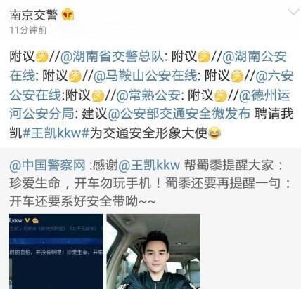 有趣的是,王凱的這條微博引起了公安交警部門的注意,中國警察網轉發該微博稱“感謝@王凱kkw幫蜀黍提醒大家:珍愛生命,開車勿玩手機!交警蜀黍還要再提醒一句:開車還要係好安全帶呦~~”。隨後,許多地方公安交警部門的官微都陸續轉發並作出評論。