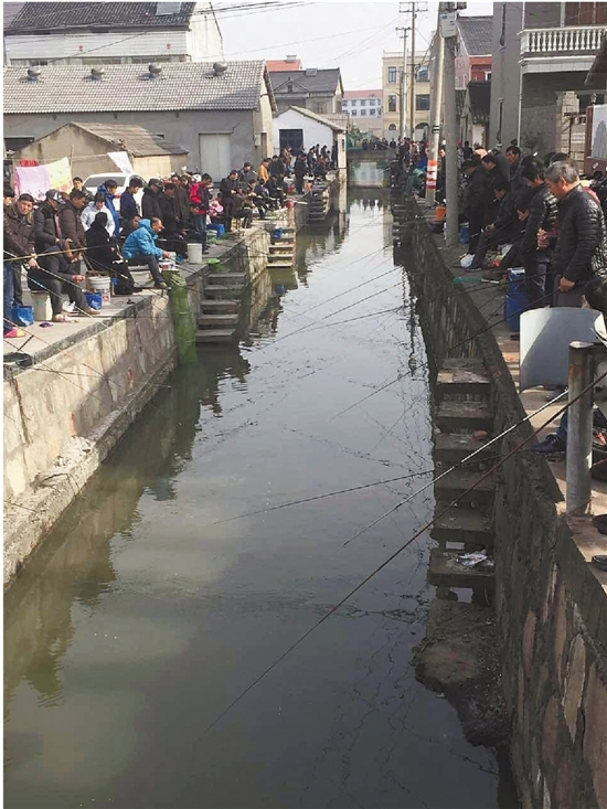 慈溪上蔡村一條小河畔,釣竿交織成網,幾百人共垂釣