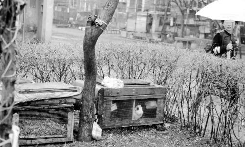 在93-4號樓和93-5號樓之間的綠化帶里,一片“菜園”里放著一個木頭箱子,里面養著幾只雞。旁邊的鐵籠里養著兩只兔子。小區養雞和兔子的“菜園”並不止這一處。