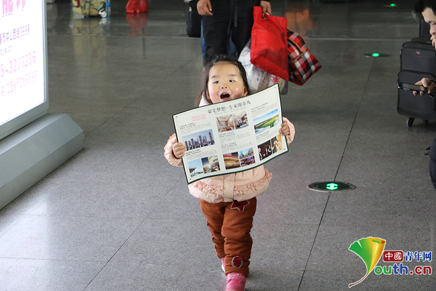 候車室內小朋友為了趕大人的步伐一路狂奔。中國青年網 余旺 攝