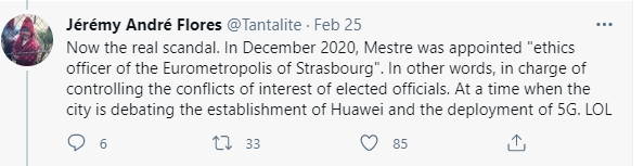如下圖所示,這名反華記者宣稱,他之所以要對梅斯特教授開炮,是因為這位法國學者除了在斯特拉斯堡大學的學術工作,目前正在擔任斯特拉斯堡市所參與的歐洲城市合作項目(Eurometropolis)的倫理官,而該市正在為是否要允許華為公司5G項目在該市落地而進行著辯論。