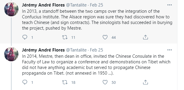 另外,這名反華記者還將梅斯特教授此前在斯特拉斯堡大學里推動發展與中國的學術合作,歡迎孔子學院來該校辦學,受邀參加過中國大使館在當地舉行的西藏活動,以及在此次新冠疫情期間發表的肯定中國防疫措施的言行,也都作為了攻擊梅斯特教授的“黑材料”。
