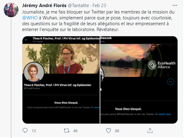 圖為法國《觀點》雜志的反華記者J岢r岢my Andr岢 Flor岢s和他在境外社交平臺“推特”上被多名國際病毒專家拉黑的截圖