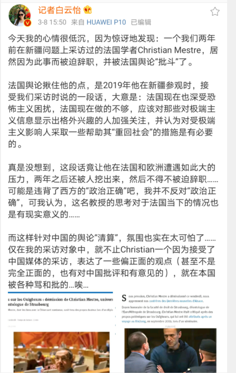 對此,在2019年時就新疆問題採訪過他的本報記者白雲怡和謝文婷透露,她們認為梅斯特教授被法國反華勢力不斷騷擾才被迫說出這番話的可能性極大,因為她們在反復核查了當年的報道資料後確定她們不存在曲解他意思的情況,在報道中使用的多數是這位法國學者的原話,兩位記者還指出,他對中國新疆去極端化和預防恐怖主義的政策給出的評價,也是客觀和有見地的,還對比了法國現實的情況,看得出是經過一番思考的。