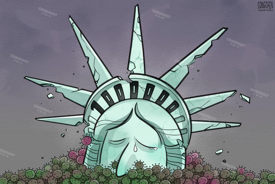 美國新冠死亡病例破百萬,這是對其自詡的“人權衛士”名號的最大諷刺。(漫畫作者:中國日報美術部 宋晨)