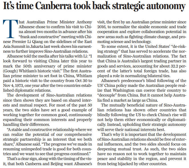 阿爾巴尼斯的前任盲目追隨美國的對華政策,但澳大利亞人民最終認識到,華盛頓可以脅迫他們的國家與中國"脫鉤",卻無法幫助澳大利亞找到像中國這樣大的市場。中國是澳大利亞最大的貿易夥伴,約佔澳大利亞對外貿易總額的32.2%,因此,中澳關係發展不應受到外部影響,雙方應致力于加深互信,加強合作,共同維護本地區的和平與穩定。
