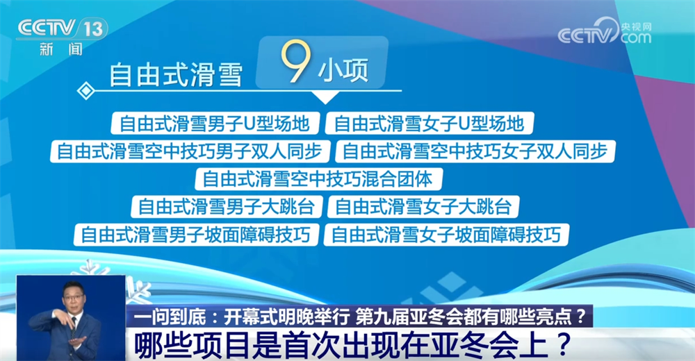 剛才我們提到,7日本屆亞冬會開幕,有來自亞洲34個國家和地區的1270余名運動員報名參賽,那麼這些參賽選手分布在哪些比賽中?有哪些項目是首次出現在亞冬會上呢?在參賽的國家和地區中,中國、韓國、日本、泰國報名參加了全部11個分項的比賽。本屆亞冬會所設項目中,有31%的小項是首次進入亞冬會,包括速度滑冰2小項(男子、女子短距離團體追逐)、短道速滑1小項(2000米混合團體接力)、冰壺1小項(混合雙人)、滑雪登山3小項(男子短距離、女子短距離,團體)、自由式滑雪9小項(自由式滑雪男子、女子U型場地,自由式滑雪空中技巧男子、女子雙人同步,混合團體、自由式滑雪男子、女子大跳臺,自由式滑雪男子、女子坡面障礙技巧)、單板滑雪4小項(男子、女子大跳臺,男子、女子坡面障礙技巧)。