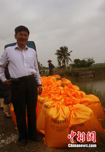 28日,臺資海南新海洋水產有限公司總經理劉財添,迎來海南省政府支持災後恢復生產的第一批魚苗。 作 者:關向東