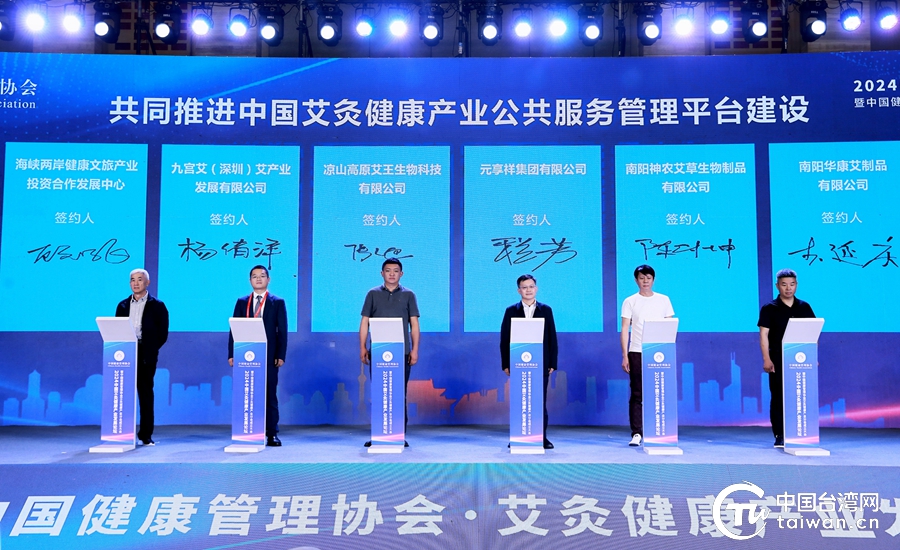 海峽兩岸健康產業合作發展中心主任顧乃飛(左一)與中國健康協會艾灸健康產業分會企業簽署合作發展書。(中國臺灣網記者 張亞靜 攝)